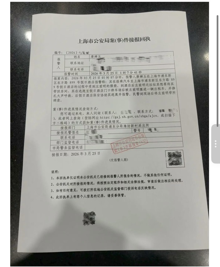与举报信同步流传的,是一张上海市公安局浦东分局潍坊新村派出所出具的《案(事)件接报回执》,编号显示为2026年。回执记载:报警人唐婵玉于2026年3月25日凌晨1时7分41秒报警,称在乘车前往浦东新区东方路899号假日酒店途中遭左前明猥亵,到店后对方持续拉扯欲将其带回房间,其在酒店门口停车场被塞入出租车后挣扎呼救,后由假日酒店保安协助离开并报警,民警到场后将左前明带走调查。回执所载人名、地点、事由与举报信高度吻合。