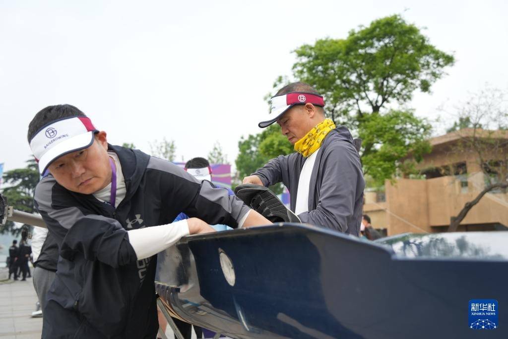 4月18日,温州百舸赛艇队选手在比赛前检查赛艇。